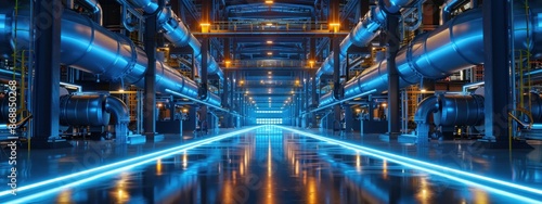 A large industrial building with a blue and yellow color scheme. The building is filled with pipes and has a futuristic feel to it