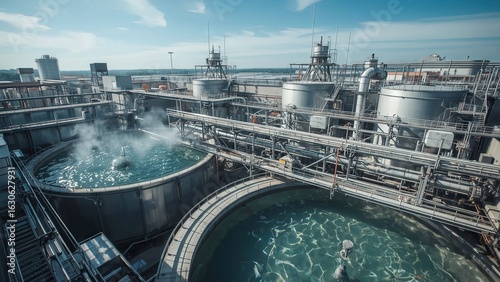 A large industrial facility with several metal tanks emitting steam, connected by pipelines, demonstrating modern manufacturing, energy production, and large-scale processing technologies.