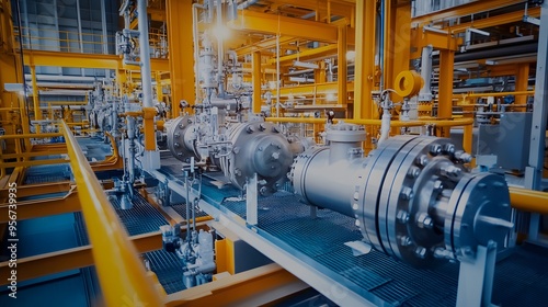 A large industrial plant with a yellow and orange color scheme. Concept of industrialization and efficiency