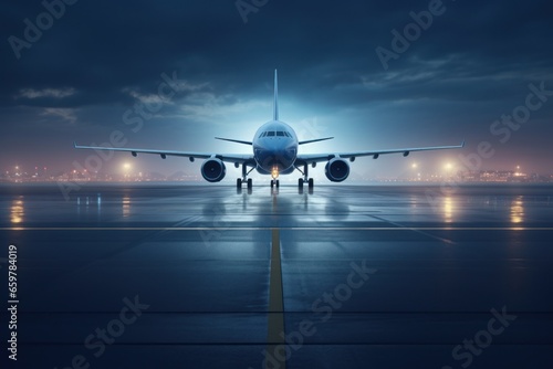A large jetliner parked on the airport tarmac, ready for takeoff. Suitable for travel and aviation-related projects