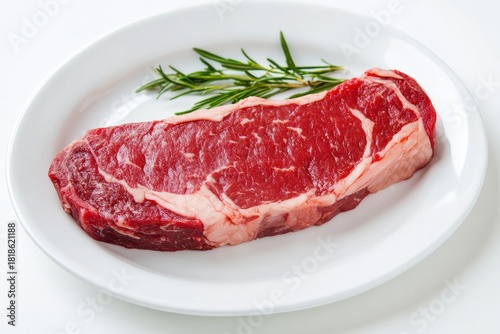 A large, juicy steak with a rich, red color and a well-marbled texture, served on a white plate with a sprig of rosemary on top.