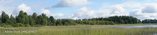 A large lake with grassy shores. The shores of the lake were overgrown with reeds. Panoramic view.