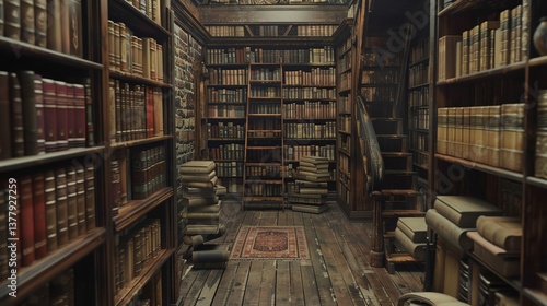 A large library with wooden shelves and a wooden floor. There are many books on the shelves and a ladder to reach the top shelves.