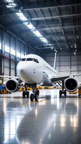 A large passenger jet sits in a hangar, reflecting on the polished floor