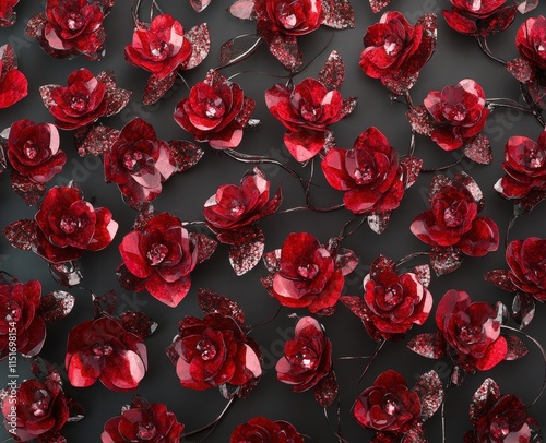 A large pattern of red roses, with each rose in full bloom and neatly arranged to create an endless sea of flowers. Wall of red roses, Valentine's Day theme
