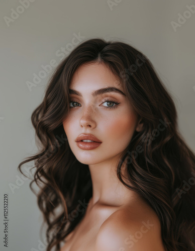 A large portrait of a young European woman with brown eyes and loose wavy hair. Portrait in a close-up beauty studio with natural makeup, looking directly into the camera on a light background
