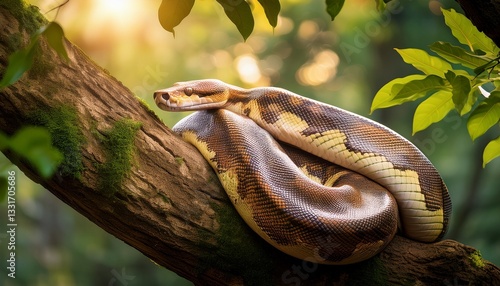 A large python coiled tightly around a thick tree branch, its intricate scales shining in the natural jungle light.