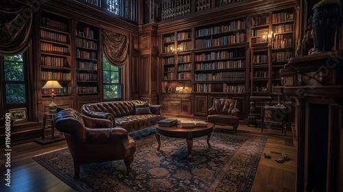 A large room with a couch, a coffee table, and a fireplace. The room is filled with bookshelves and a large collection of books. The room has a cozy and inviting atmosphere, perfect for reading