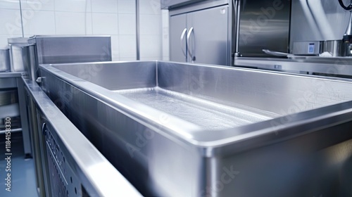 A large stainless steel container holding ingredients inside a food processing factory. No people, copy space.