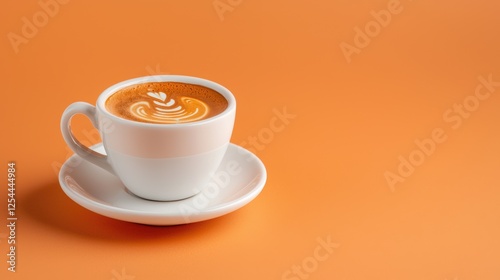 A latte art coffee cup on a white saucer against a vibrant orange background, showcasing a warm and inviting aesthetic.