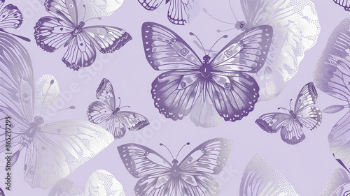 A lavender and silver butterfly pattern wallpaper, with each butterfly outlined in shimmering metallic foil for an enchanting touch. The design features fluttering butterflies,