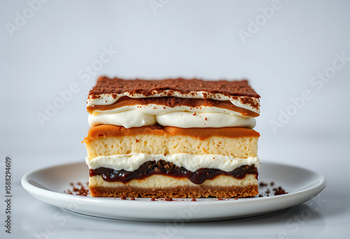 A layered tiramisu cake with cream and cocoa powder
