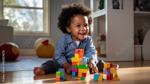 A lifestyle photograph of a young African American toddler playing with colorful wooden block toys, Generative Ai