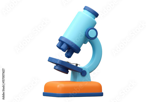 A light blue microscope with orange base and dark blue accents on a plain dark setting on transparent background