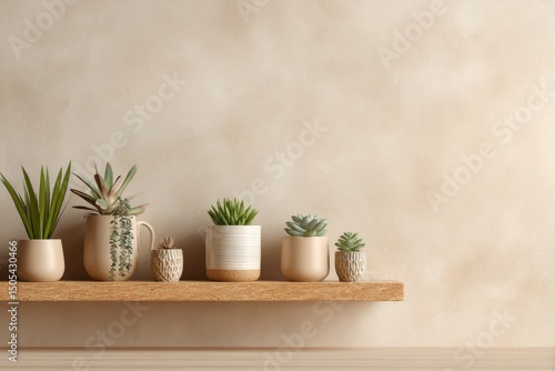 A light wood shelf holds a collection of succulents and small potted plants against a beige wall. The plants vary in size and type, showcasing a minimalist, earthy aesthetic