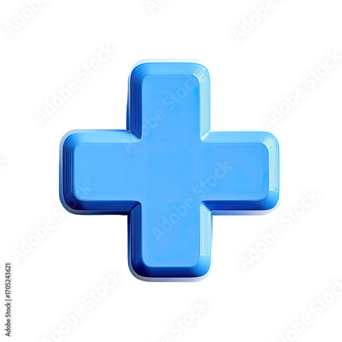 A light-blue, three-dimensional plus sign with rounded edges, set against a black background, appearing as a button or icon