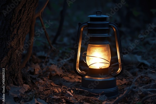 A Lighted Lantern Stands Alone in a Dark Forest