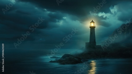A lighthouse illuminating a path over uncharted waters, symbolizing the vision guiding exploration towards a promising future