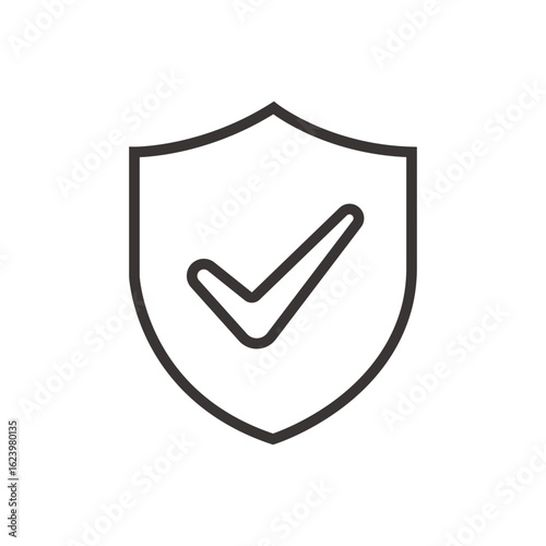 A line art icon of a checkmark inside a shield, symbolizing security, protection, and verified safety.