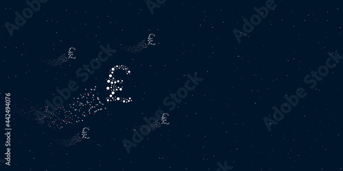 A lira symbol filled with dots flies through the stars leaving a trail behind. Four small symbols around. Empty space for text on the right. Vector illustration on dark blue background with stars