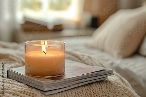 A lit candle sits on a book resting on a soft blanket. The candle is a symbol of relaxation and comfort.