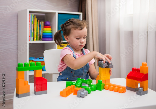 a little girl is playing a multi-colored constructor at a table in the children's room