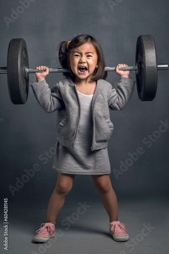 A little girl with a angry expression expressing strength, lifts a heavy barbell - ai generative