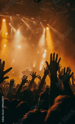 A lively concert scene featuring an enthusiastic crowd with hands raised, fully immersed in the music as vibrant stage lights create an electrifying atmosphere.