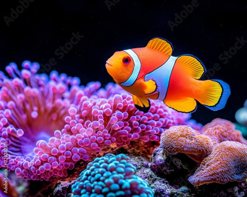 A lively coral reef bustling with colorful marine creatures beneath the surface.