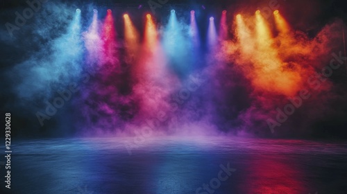 A lively stage filled with colorful spotlights and smoke creating a dynamic scene, AI generated
