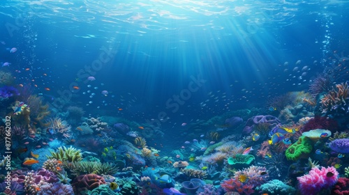 A lively underwater scene depicting an abundant coral reef teeming with marine life, including various species of fish and corals, beautifully highlighted by sunlight filtering through the water.