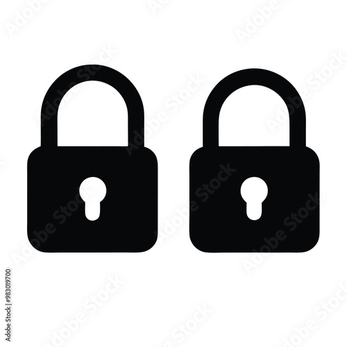 a Locked and unlocked lock icon, vector silhouette, isolated white background,