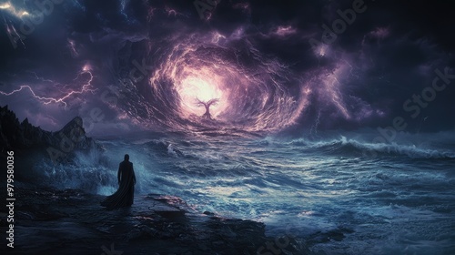 A lone figure standing at the edge of a dark, stormy ocean, their back turned to the viewer. The waves crash violently against jagged rocks, sending mist
