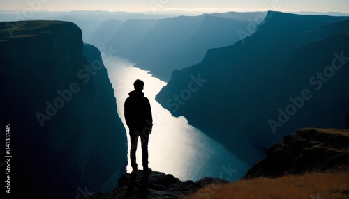 A lone figure stands at the edge of a canyon, silhouetted against the setting sun. The vast landscape and serene atmosphere evoke a sense of awe and contemplation.. AI Generation