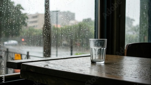 A lone glass on a dimly lit table with rain pouring outside through the window, empty table, dramatic lighting