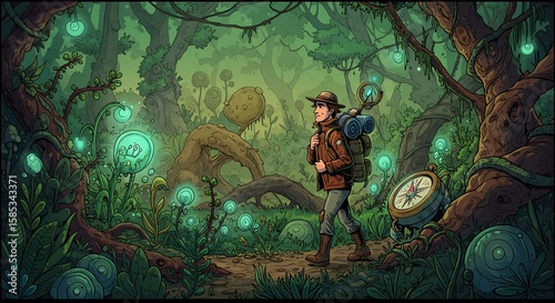 A lone hiker exploring a mystical, glowing forest, carrying a backpack and compass.