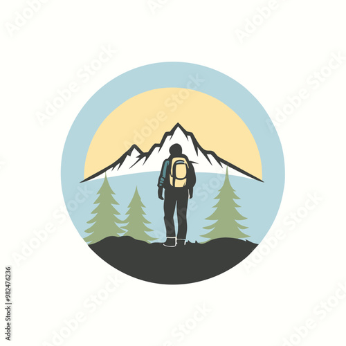 a lone hiker standing on a rocky terrain. The hiker, wearing a backpack, vectorstyle illustration on a white background,