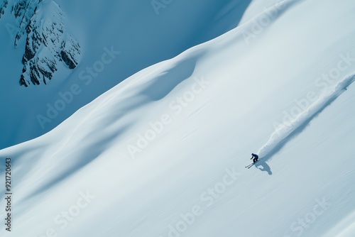 A lone skier gliding effortlessly over pristine snow in a breathtaking mountain landscape.