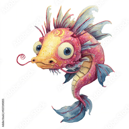 A lone watercolor brilliant cute Mazu with a mini sea dragon and big eyes