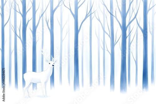 A lone, white deer stands in a serene, snow-covered forest of slender, bare trees under a hazy sky