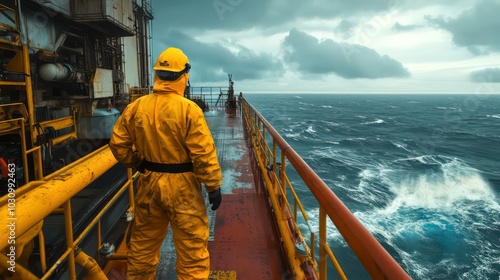 A lone worker in a yellow protective suit stands on the deck of a ship in the middle of a stormy sea.