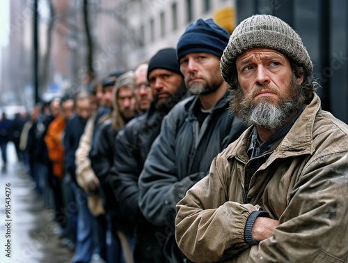 A long line of people waiting outside an unemployment office, their faces reflecting hopelessness and anxiety