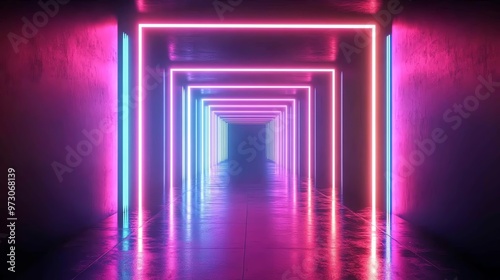 A long, narrow corridor with glowing neon lights in pink and blue.