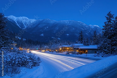 A long-exposure photograph of the lights from cars driving on an icy highway in British Columbia