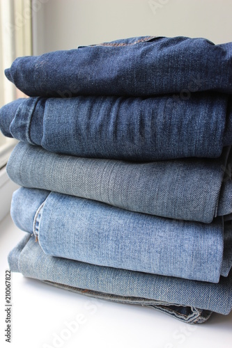 A lot of things blue jeans stacked in a pile on white background