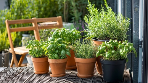 A lovely wooden balcony features an array of potted herbs, including basil and thyme, alongside two inviting chairs. Sunlight bathes the serene space in warmth, perfect for leisure and gardening