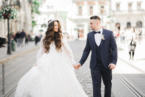 A loving wedding couple are walking back along the streets of the city of Lviv