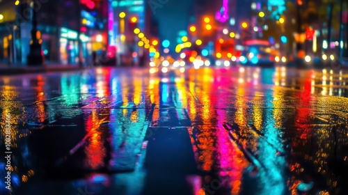 A low angle view of a wet city street at night, with colorful lights reflecting in the puddles.