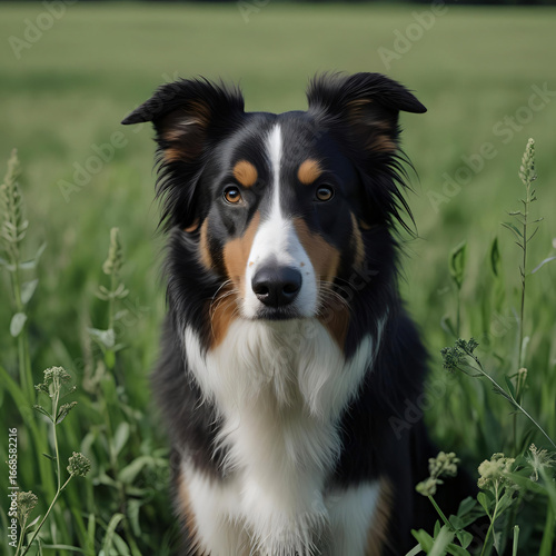 A loyal dog sits peacefully in the lush green grass, a serene and heartwarming portrait of a domestic companion enjoying the outdoors.