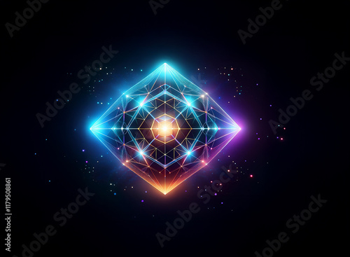 A luminous, geometric structure glows vibrantly against a dark background. Intricate lines and nodes create a multifaceted, otherworldly gem. Its radiant energy captivates.